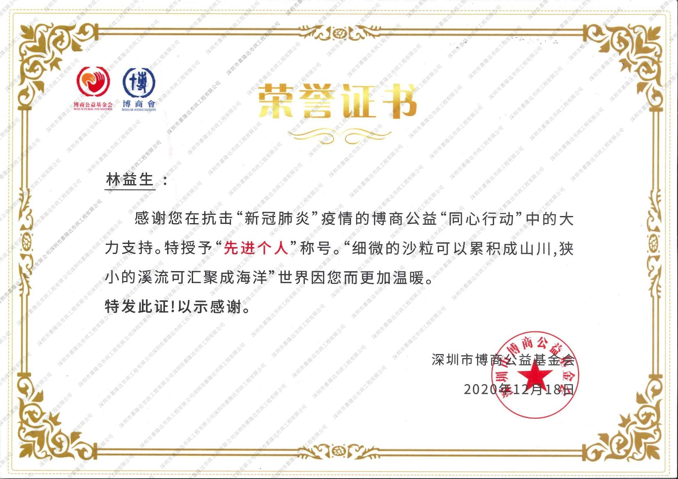 抗擊新冠肺炎榮譽證書